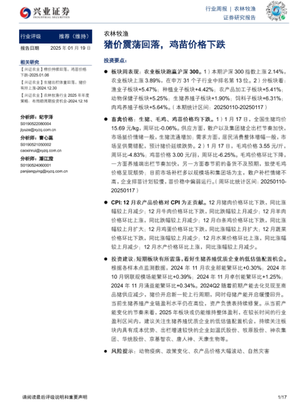 【兴业证券】【20250119】20250119-兴业证券-农林牧渔行业周报:猪价震荡回落,鸡苗价格下跌-17页