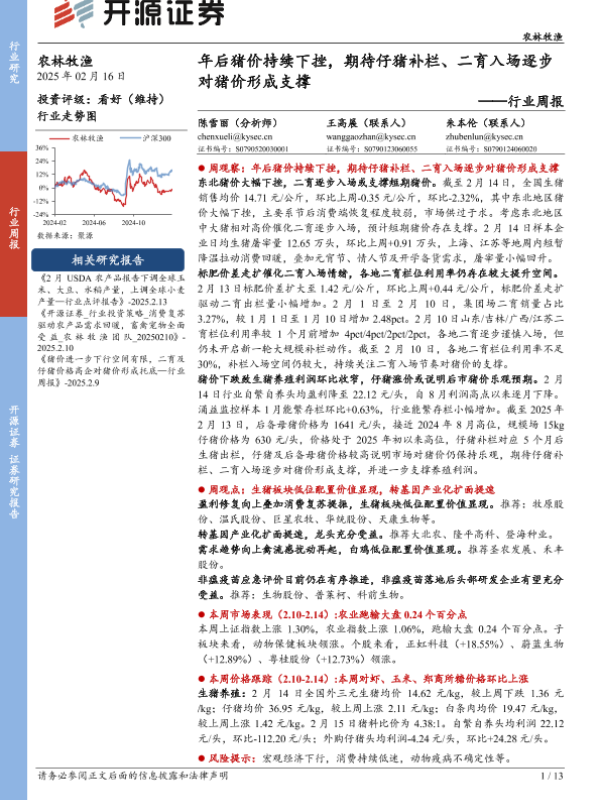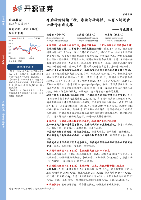 【开源证券】【20250216】农林牧渔行业周报:年后猪价持续下挫,期待仔猪补栏、二育入场逐步对猪价形成支撑-13页