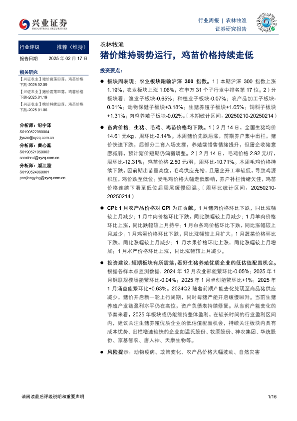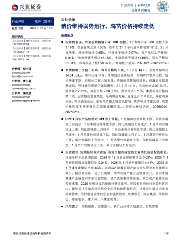 【兴业证券】【20250217】20250217-兴业证券-农林牧渔行业周报:猪价维持弱势运行,鸡苗价格持续走低-16页