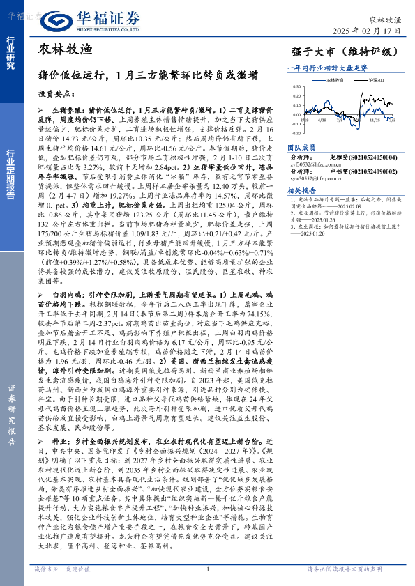 【华福证券】【20250217】20250217-华福证券-农林牧渔行业定期报告:猪价低位运行,1月三方能繁环比转负或微增-13页
