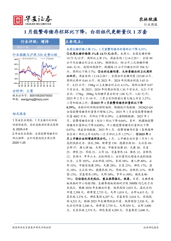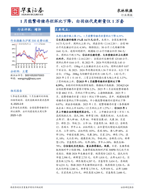 【华安证券】【20250222】20250222-华安证券-农林牧渔行业周报:1月能繁母猪存栏环比下降,白羽祖代更新量仅1万套-43页