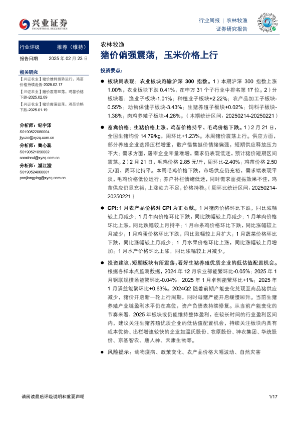 【兴业证券】【20250223】20250223-兴业证券-农林牧渔行业周报:猪价偏强震荡,玉米价格上行-17页