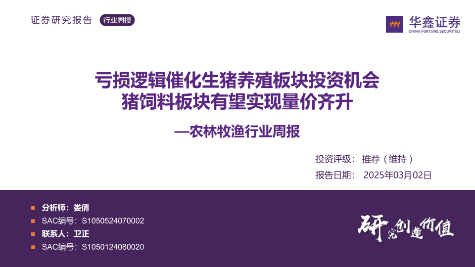【华鑫证券】【20250302】20250302-华鑫证券-农林牧渔行业周报:亏损逻辑催化生猪养殖板块投资机会 猪饲料板块有望实现量价齐升-33页