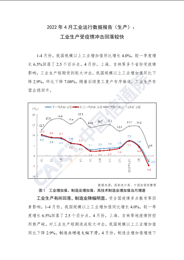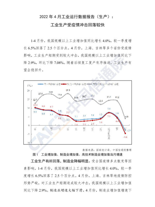 【中国信通院】【202204】2022年4月工业运行数据报告(生产):工业生产受疫情冲击回落较快-8页