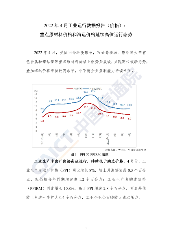 【中国信通院】【2022】2022年4月工业运行数据报告(价格):重点原材料价格和海运价格延续高位运行态势-7页