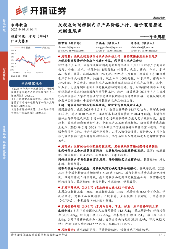 【开源证券】【20250309】农林牧渔行业周报:关税反制助推国内农产品价格上行,猪价震荡磨底或渐至尾声-12页
