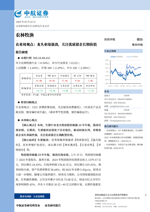 【中航证券】【20250322】农业周观点:龙头业绩强劲,关注优质猪企长期价值-14页