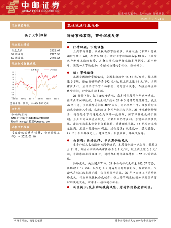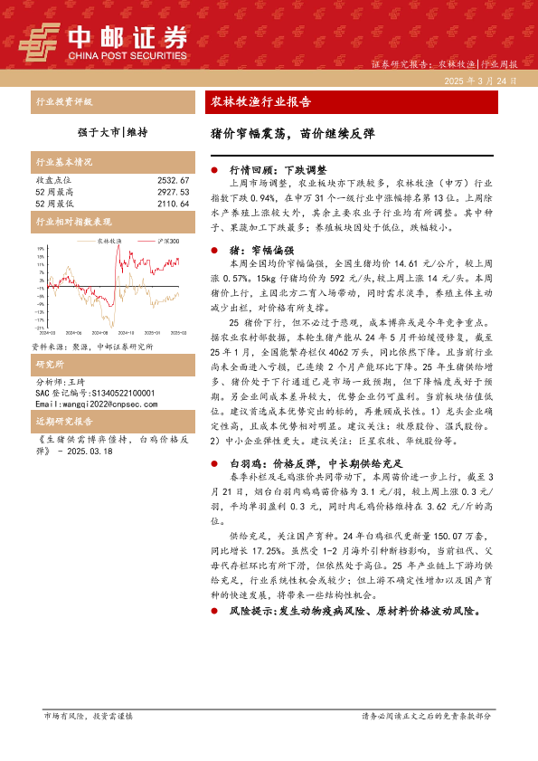 【中邮证券】【20250324】20250324-中邮证券-农林牧渔行业报告:猪价窄幅震荡,苗价继续反弹-11页