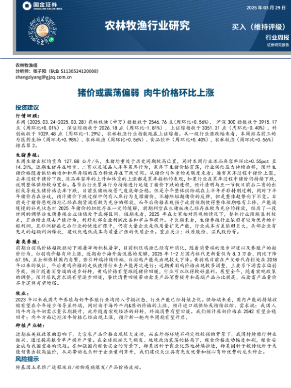 【国金证券】【20250329】20250329-国金证券-农林牧渔行业研究:猪价或震荡偏弱 肉牛价格环比上涨-14页