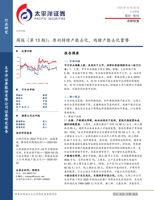 【太平洋证券】【20250330】20250330-太平洋-农林牧渔周报(第13期):原奶持续产能去化,鸡猪产能去化蓄势-17页