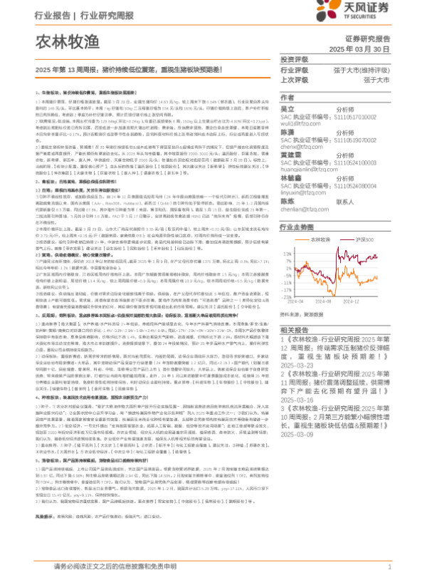 【天风证券】【20250330】农林牧渔2025年第13周周报:猪价持续低位震荡,重视生猪板块预期差!-16页