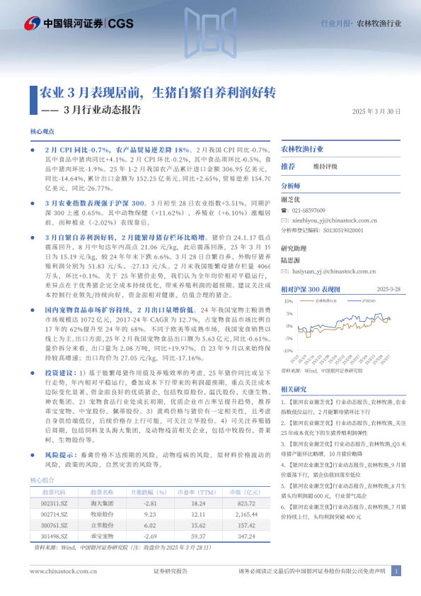 【银河证券】【20250330】20250330-中国银河-农林牧渔行业:3月行业动态报告-农业3月表现居前,生猪自繁自养利润好转-22页