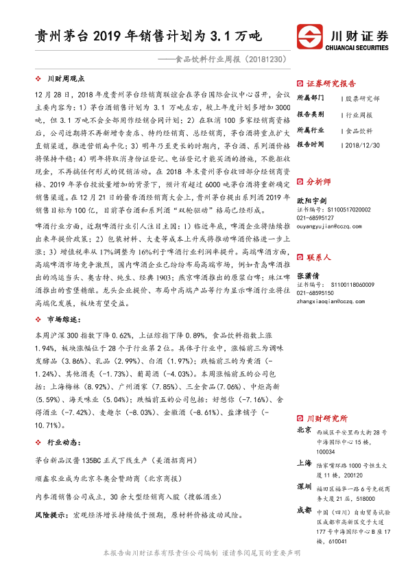 【川财证券】【20181230】食品饮料行业周报:贵州茅台2019年销售计划为3.1万吨-12页