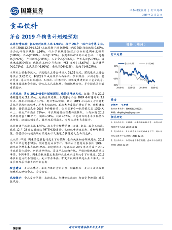 【国盛证券】【20190101】食品饮料行业周报:茅台2019年销售计划超预期-19页