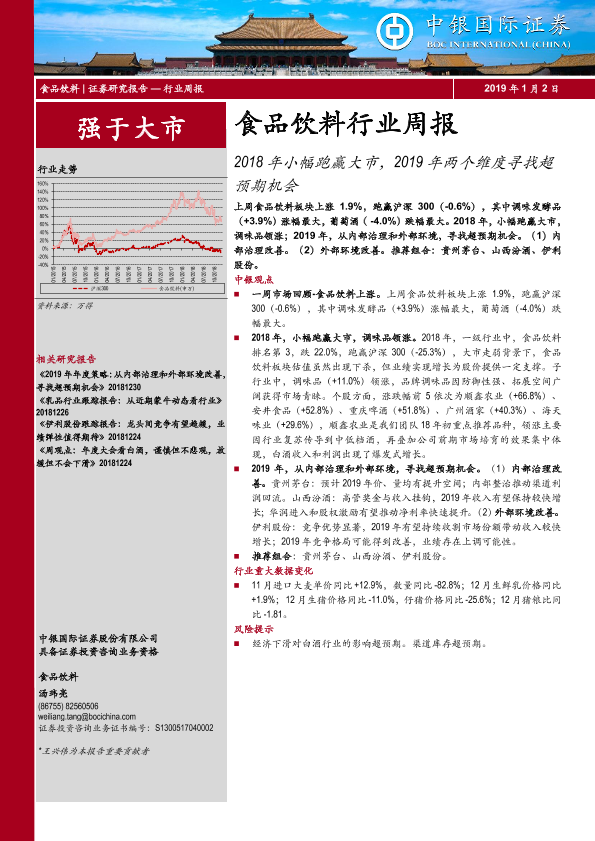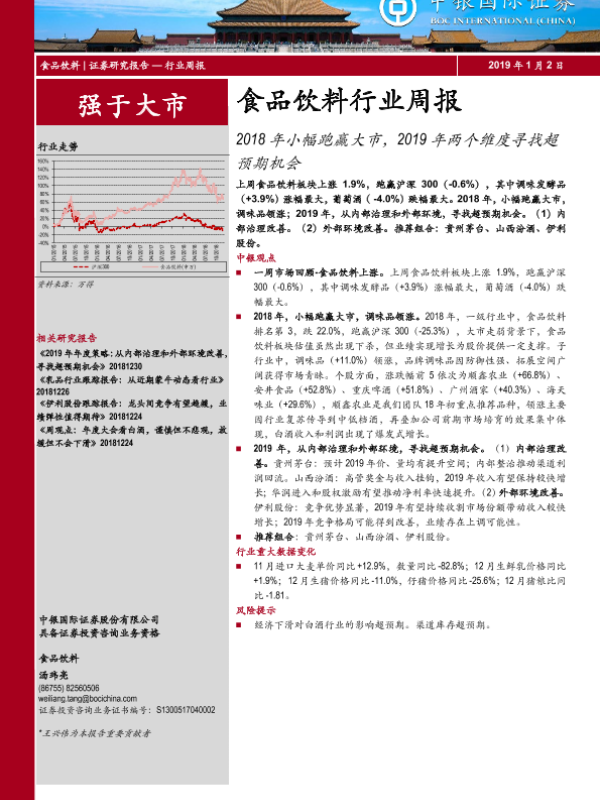 【中银证券】【20190102】20190102-中银证券-食品饮料行业周报:2018年小幅跑赢大市,2019年两个维度寻找超预期机会-16页