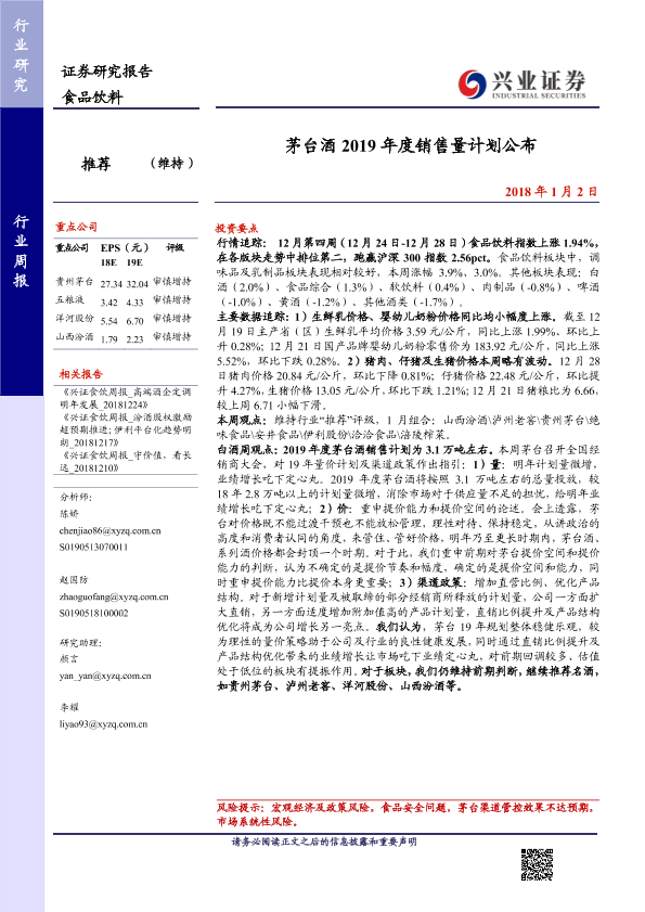 【兴业证券】【20190102】食品饮料行业周报:茅台酒2019年度销售量计划公布-9页