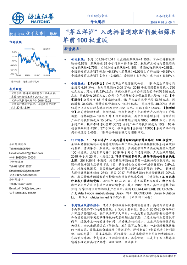 【海通证券】【20190106】20190106-海通证券-食品行业周报:“茅五洋泸”入选标普道琼斯指数初筛名单前100权重股-15页