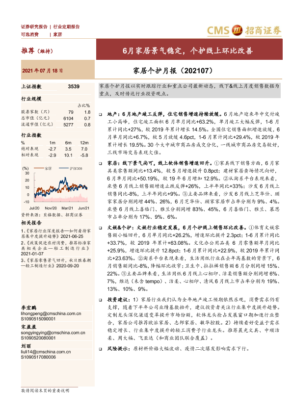 【海通证券】【20210718】家居行业个护月报(202107):6月家居景气稳定,个护线上环比改善-22页