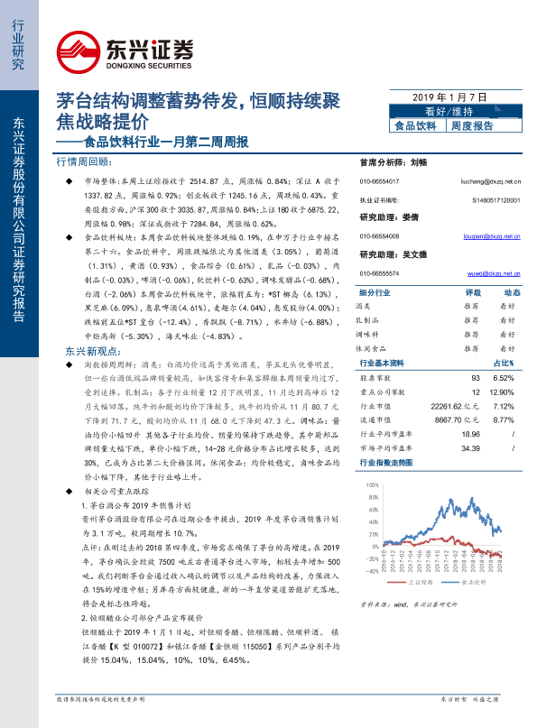【东兴证券】【20190107】食品饮料行业一月第二周周报:茅台结构调整蓄势待发,恒顺持续聚焦战略提价-42页