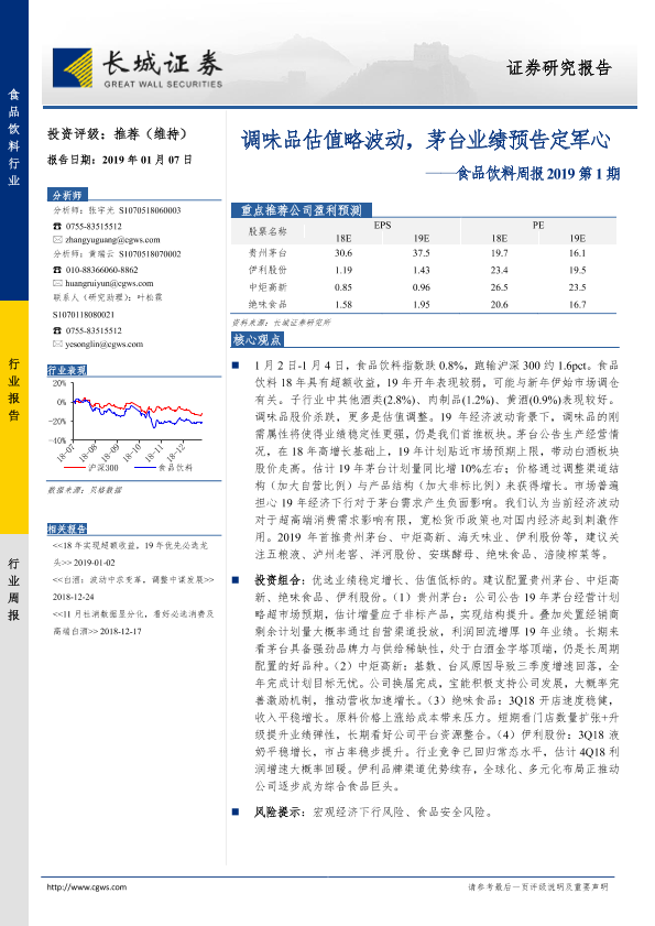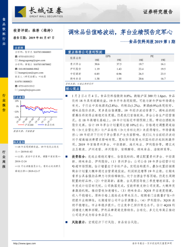 【长城证券】【20190107】20190107-长城证券-食品饮料周报2019第1期:调味品估值略波动,茅台业绩预告定军心-9页