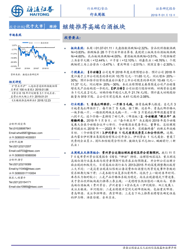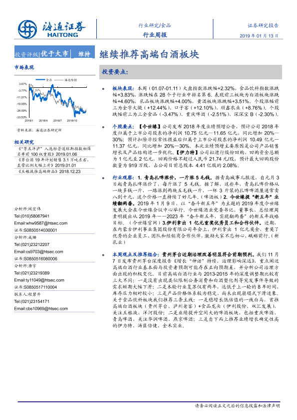 【海通证券】【20190113】20190113-海通证券-食品行业周报:继续推荐高端白酒板块-15页