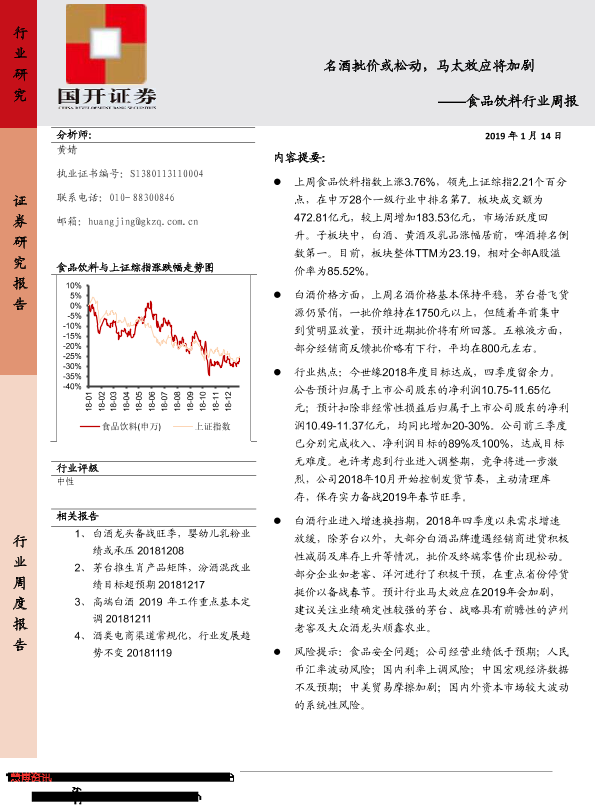 【国开证券】【20190114】食品饮料行业周报:料名酒批价或松动,马太效应将加剧-8页