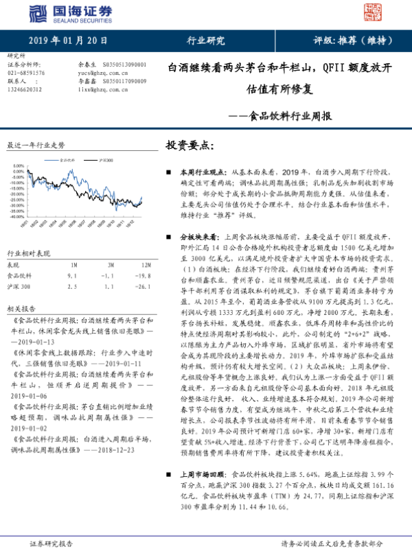 【国海证券】【20190120】20190120-国海证券-食品饮料行业周报:白酒继续看两头茅台和牛栏山,QFII额度放开估值有所修复-25页