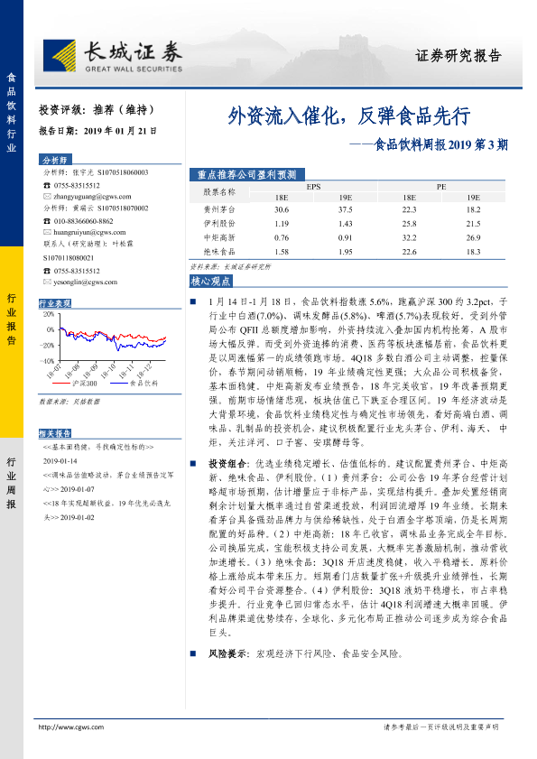 【长城证券】【20190121】食品饮料周报2019第3期:食品饮料周报外资流入催化,反弹食品先行-10页