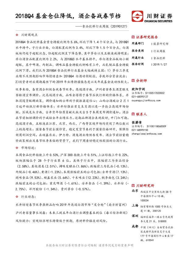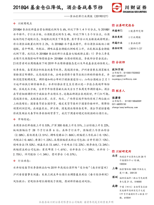 【川财证券】【20190127】20190127-川财证券-食品饮料行业周报:2018Q4基金仓位降低,酒企备战春节档-13页