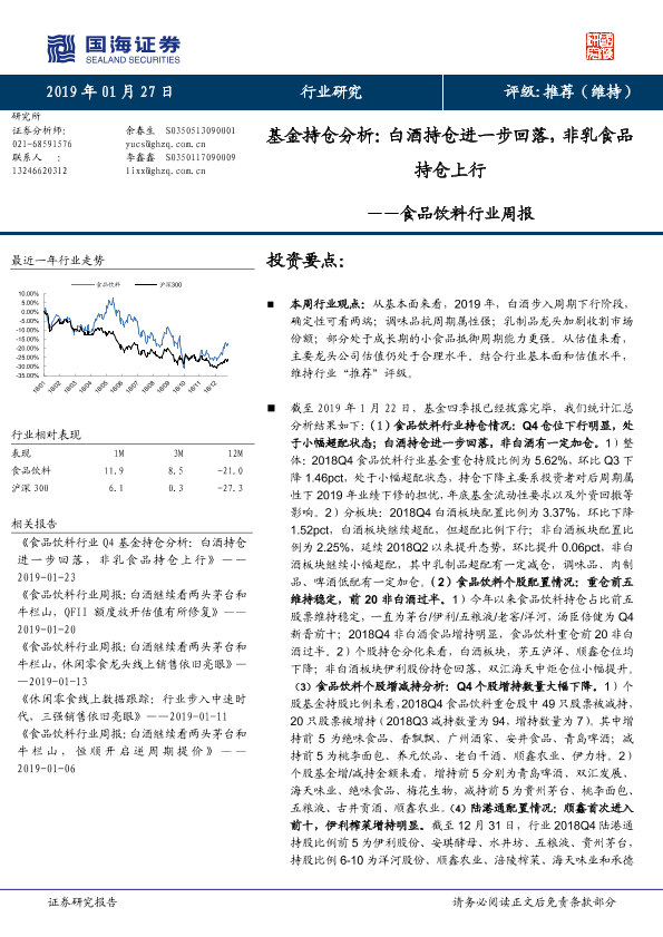 【国海证券】【20190127】食品饮料行业周报:基金持仓分析:白酒持仓进一步回落,非乳食品持仓上行-26页