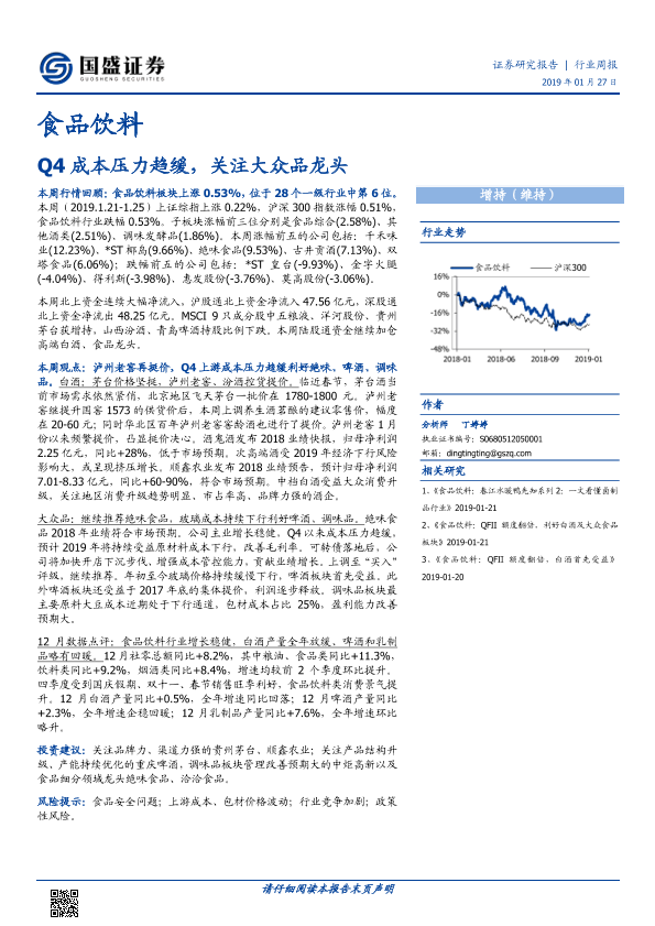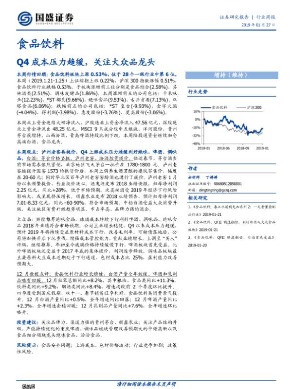 【国盛证券】【20190127】20190127-国盛证券-食品饮料行业周报:Q4成本压力趋缓,关注大众品龙头-18页