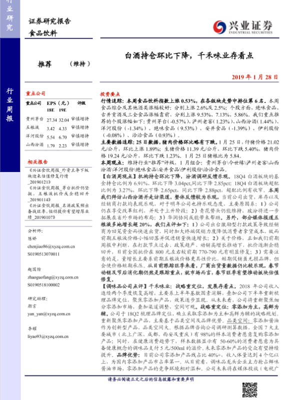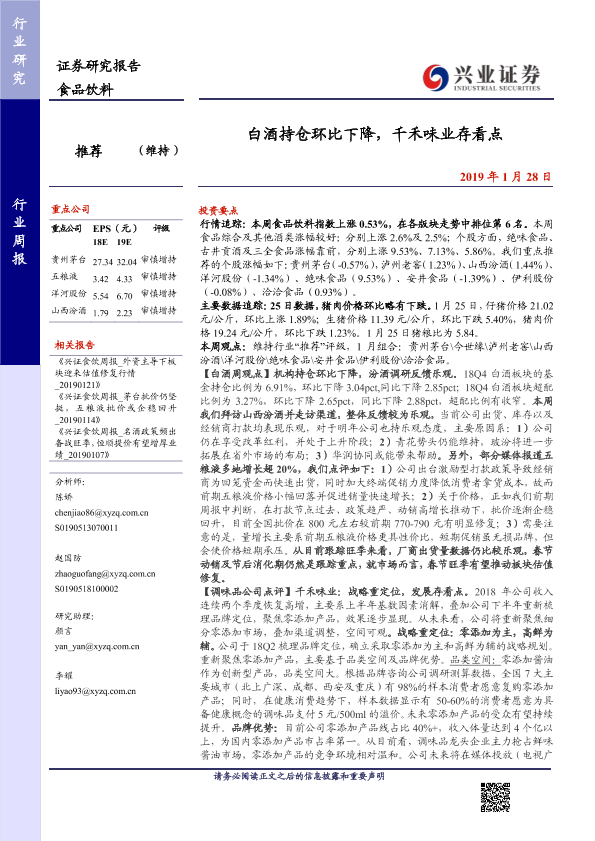 【兴业证券】【20190128】20190128-兴业证券-食品饮料行业周报:白酒持仓环比下降,千禾味业存看点-10页