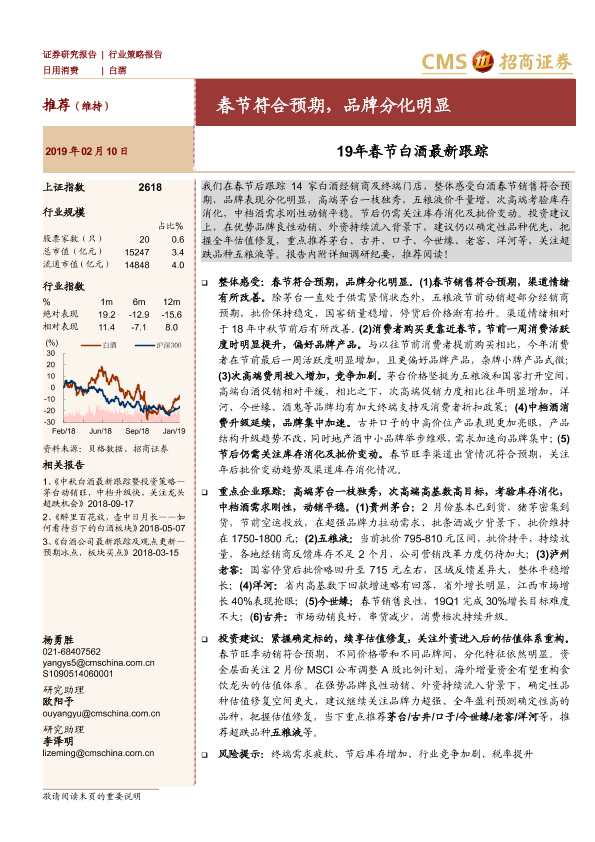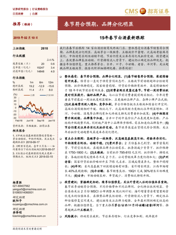 【海通证券】【20190210】20190210-招商证券-日用消费行业策略报告:19年春节白酒最新跟踪:春节符合预期,品牌分化明显-11页