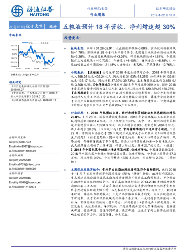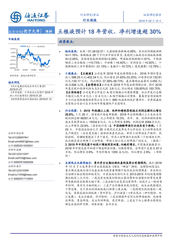 【海通证券】【20190210】20190210-海通证券-食品行业周报:五粮液预计18年营收、净利增速超30%-16页