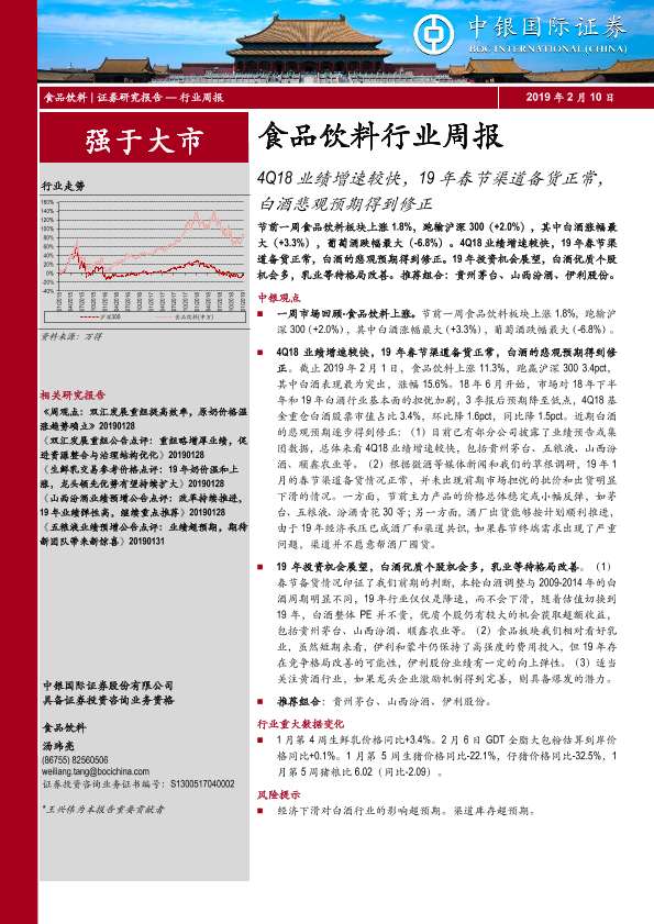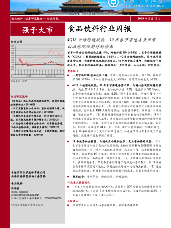 【中银证券】【20190210】20190210-中银证券-食品饮料行业周报:4Q18业绩增速较快,19年春节渠道备货正常,白酒悲观预期得到修正-17页