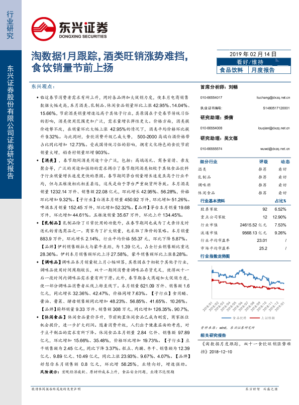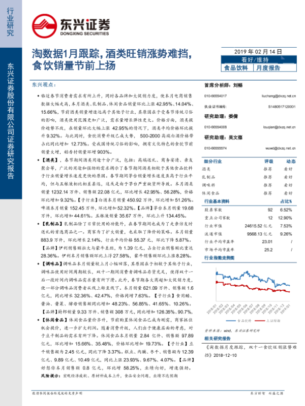 【东兴证券】【20190214】20190214-东兴证券-食品饮料月度报告:淘数据1月跟踪 酒类旺销涨势难挡,食饮销量节前上扬-23页