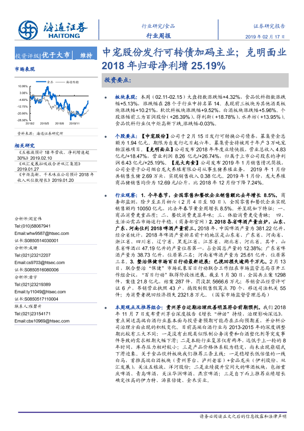 【海通证券】【20190217】20190217-海通证券-食品行业周报:中宠股份发行可转债加码主业;克明面业2018年归母净利增25.19%-16页