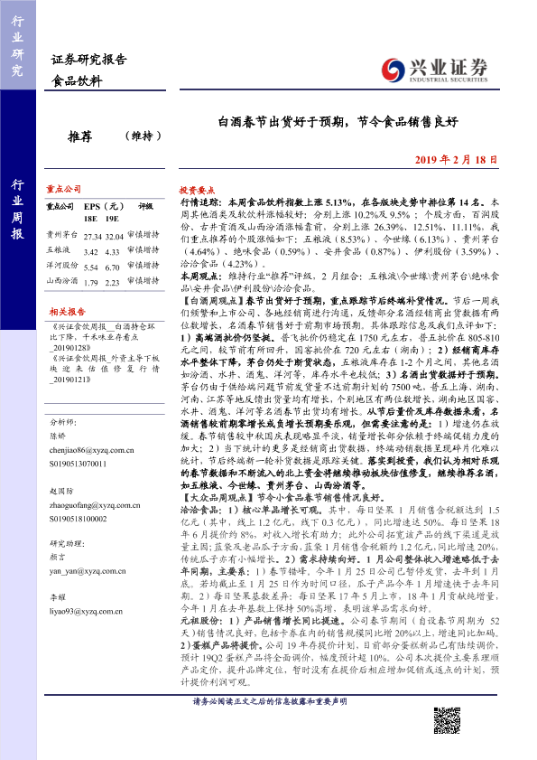 【兴业证券】【20190218】20190218-兴业证券-食品饮料行业周报:白酒春节出货好于预期,节令食品销售良好-10页