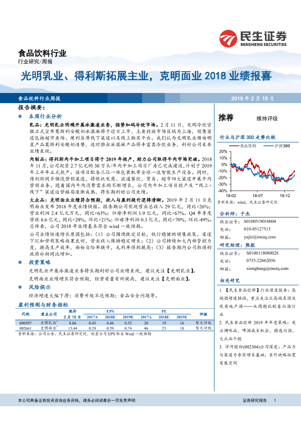 【民生证券】【20190218】食品饮料行业周报:光明乳业、得利斯拓展主业,克明面业2018业绩报喜-14页