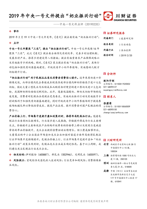 【川财证券】【20190220】2019年中央一号文件提出“奶业振兴行动”-2页