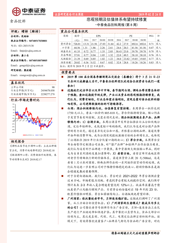 【中泰证券】【20190224】中泰食品饮料周报(第8周):悲观预期及估值体系有望持续修复-10页