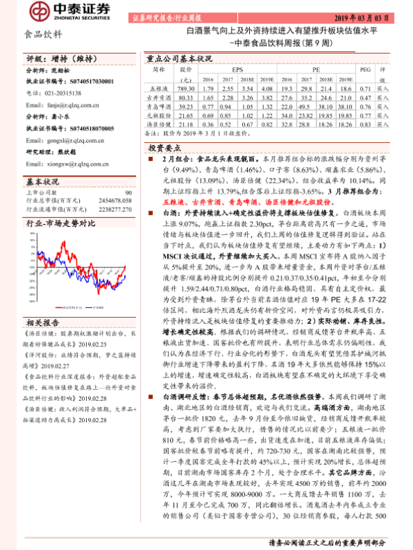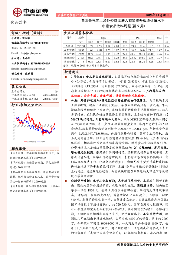 【中泰证券】【20190303】中泰食品饮料周报(第9周):白酒景气向上及外资持续进入有望推升板块估值水平-13页