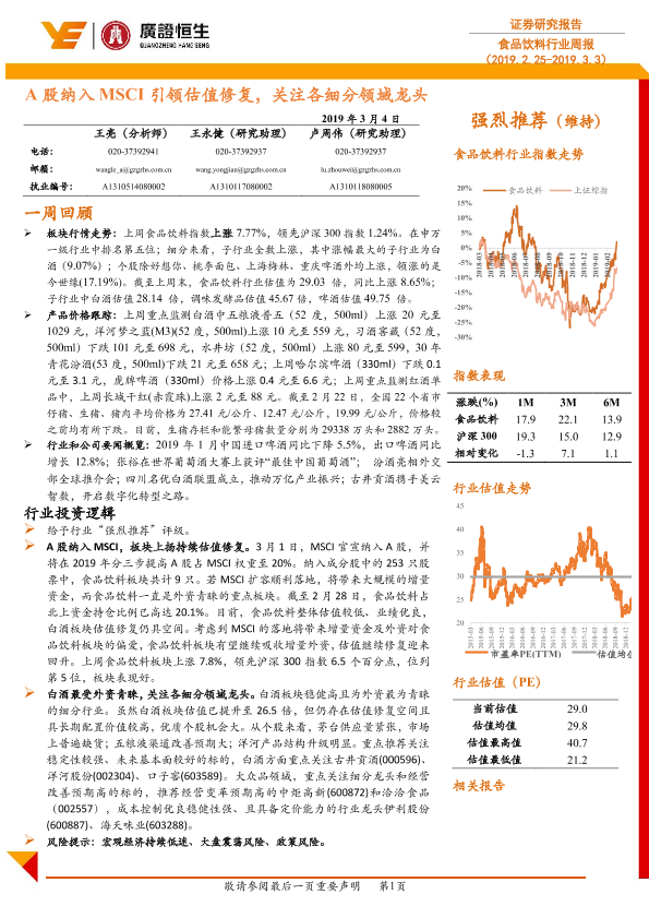 【广证恒生】【20190304】20190304-广证恒生证券研究所-食品饮料行业周报:A股纳入MSCI引领估值修复,关注各细分领域龙头-15页