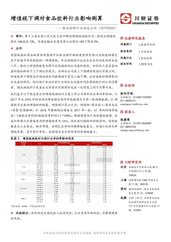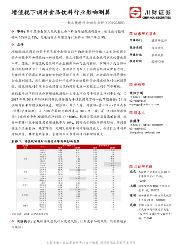 【川财证券】【20190305】食品饮料行业动态点评:增值税下调对食品饮料行业影响测算-2页