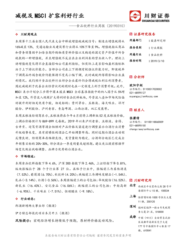 【川财证券】【20190310】20190310-川财证券-食品饮料行业周报:减税及MSCI扩容利好行业-14页