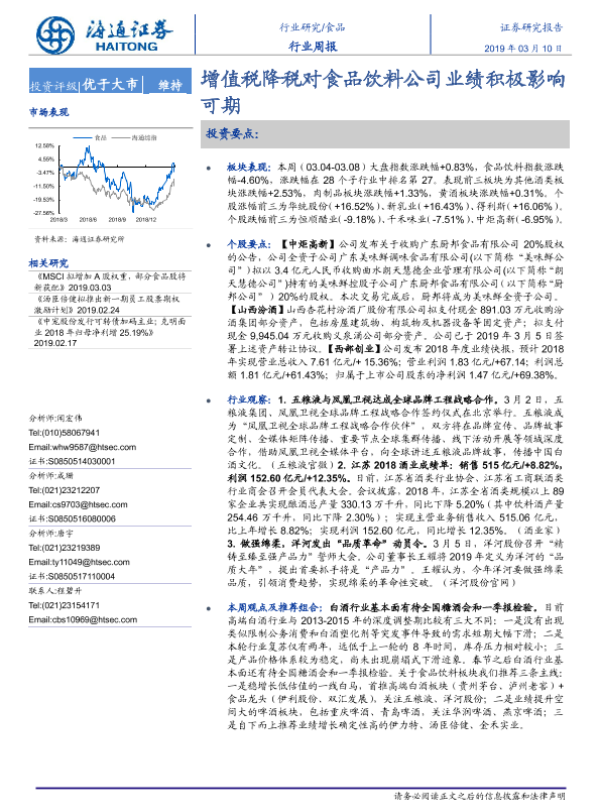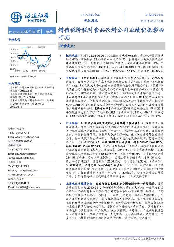 【海通证券】【20190310】食品行业周报:增值税降税对食品饮料公司业绩积极影响可期-18页