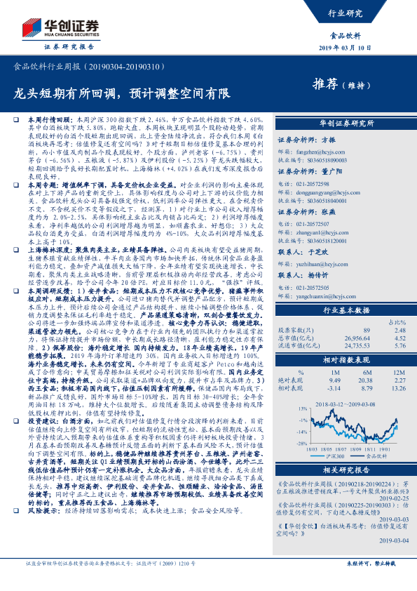 【华创证券】【20190310】20190310-华创证券-食品饮料行业周报:龙头短期有所回调,预计调整空间有限-23页