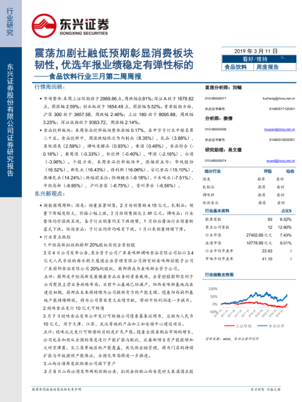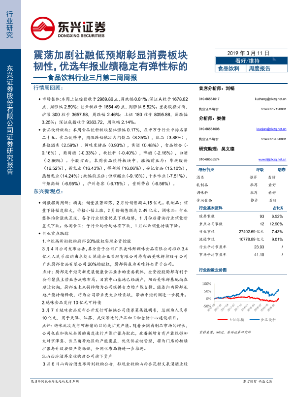 【东兴证券】【20190311】食品饮料行业三月第二周周报:震荡加剧社融低预期彰显消费板块韧性,优选年报业绩稳定有弹性标的-44页