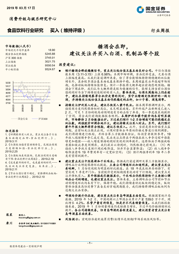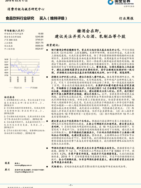 【国金证券】【20190317】食品饮料行业研究周报:糖酒会在即,建议关注并买入白酒、乳制品等个股-20页