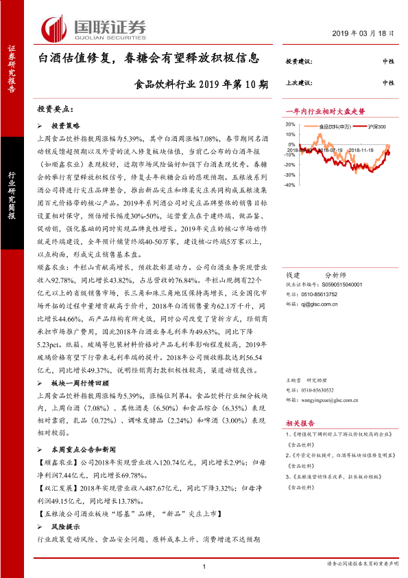 【国联证券】【20190318】食品饮料行业2019年第10期:白酒估值修复,春糖会有望释放积极信息-13页